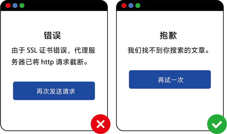 示例:在用户可能感到沮丧的情况下不要幽默。例如,如果你的应用与旧设备不兼容,请不要用有趣的方式说出来,因为此时用户可能很沮丧,无法感知幽默。