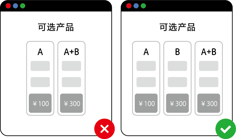 示例:假设有产品 A 和 B ,以下是顾客可以选择的选项:(1)¥100 - A (2)¥300 - B (3)¥300 - A+B ,在这个情景,(2)是“诱饵”,用来引导顾客选择“目标选项”(3)。