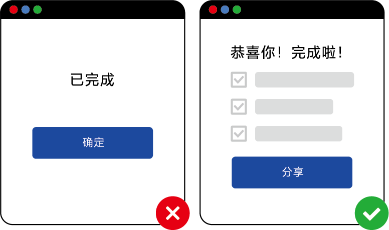 示例:在用户做出购买决定并成功达成交易之后,是用户分享产品(或添加评论)的绝佳时机;显示肯定的信息,并祝贺他们达成了这一步骤以激励用户。